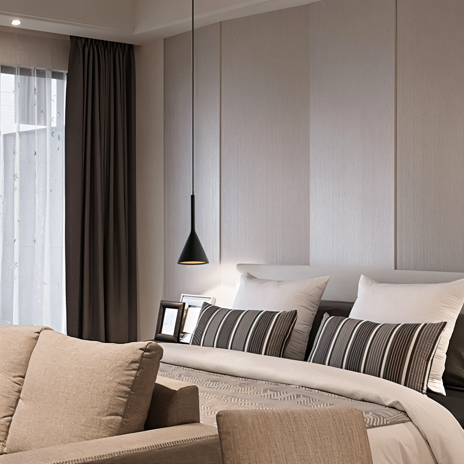 De moderne koniske pendler kombinerer enkelt nordisk design med funktionel elegance. Denne loftslampe giver harmonisk belysning og passer perfekt ind i minimalistisk eller moderne interiør.