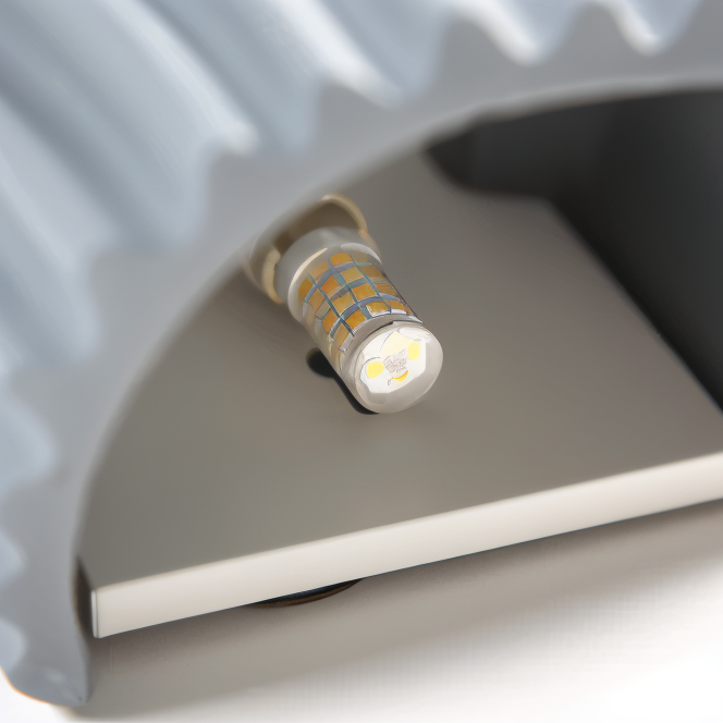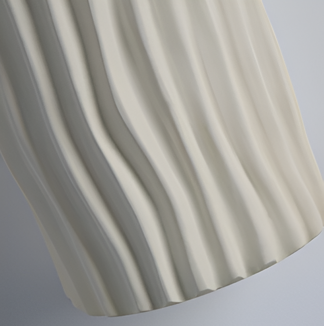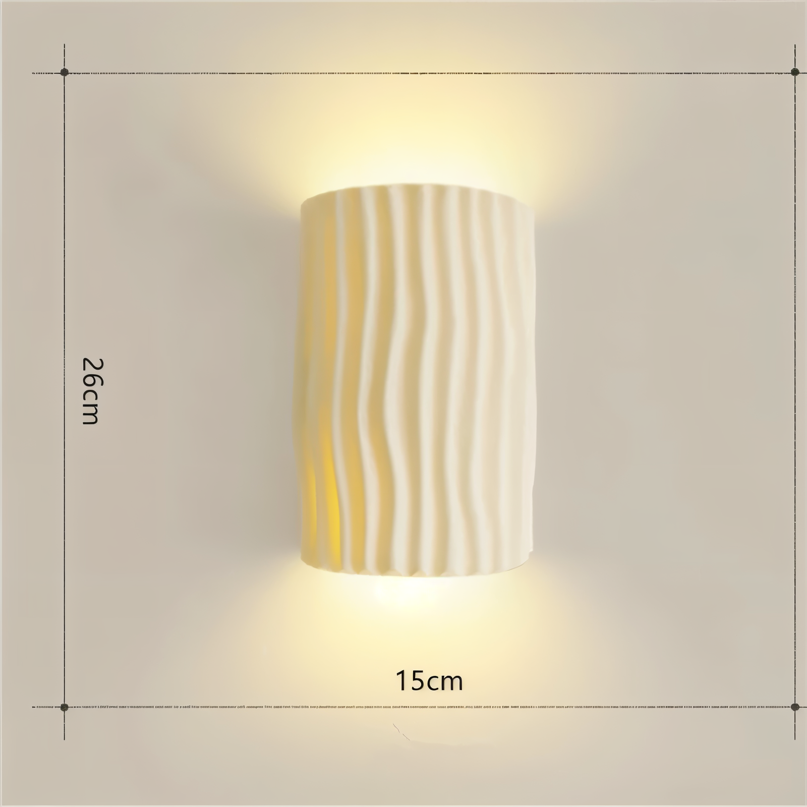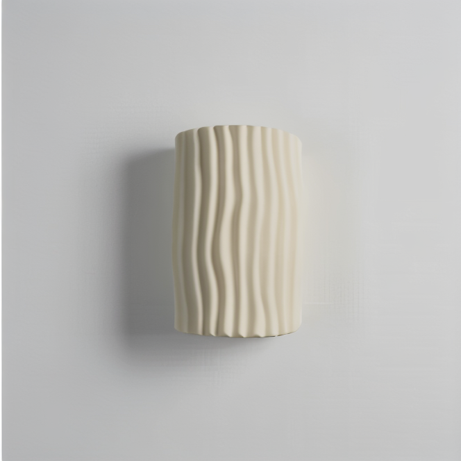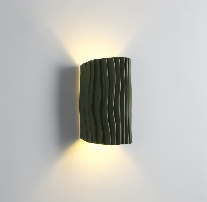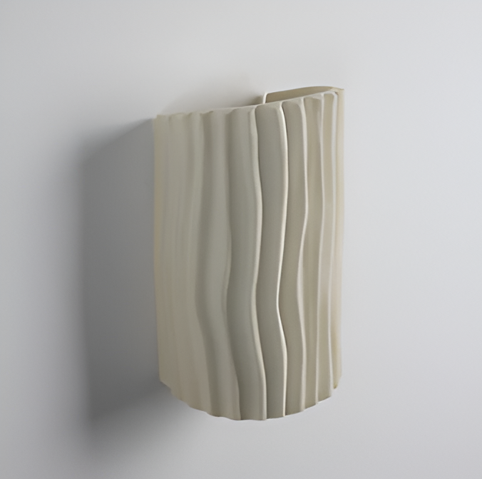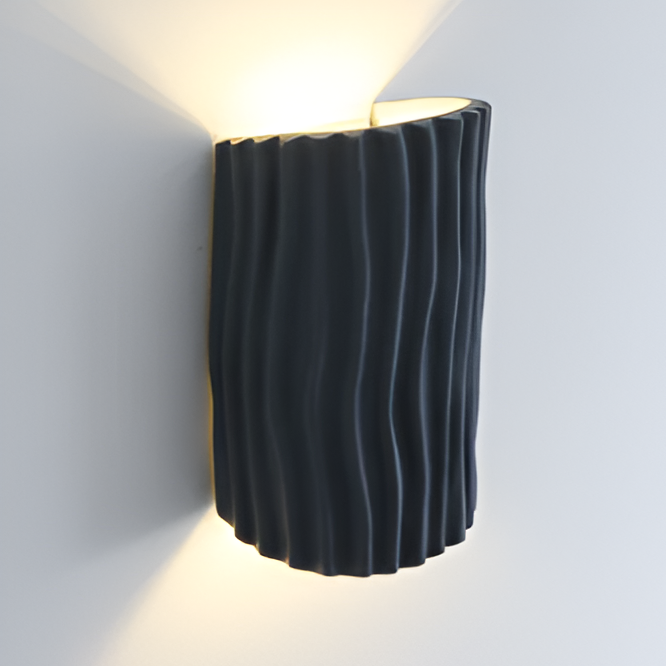 Huepleat-væglampe har et elegant kurvet design med en plisseret overflade af harpiks. Den giver guidet op- og nedadgående belysning, der skaber en stemningsfuld atmosfære, perfekt til moderne og sofistikerede rum.