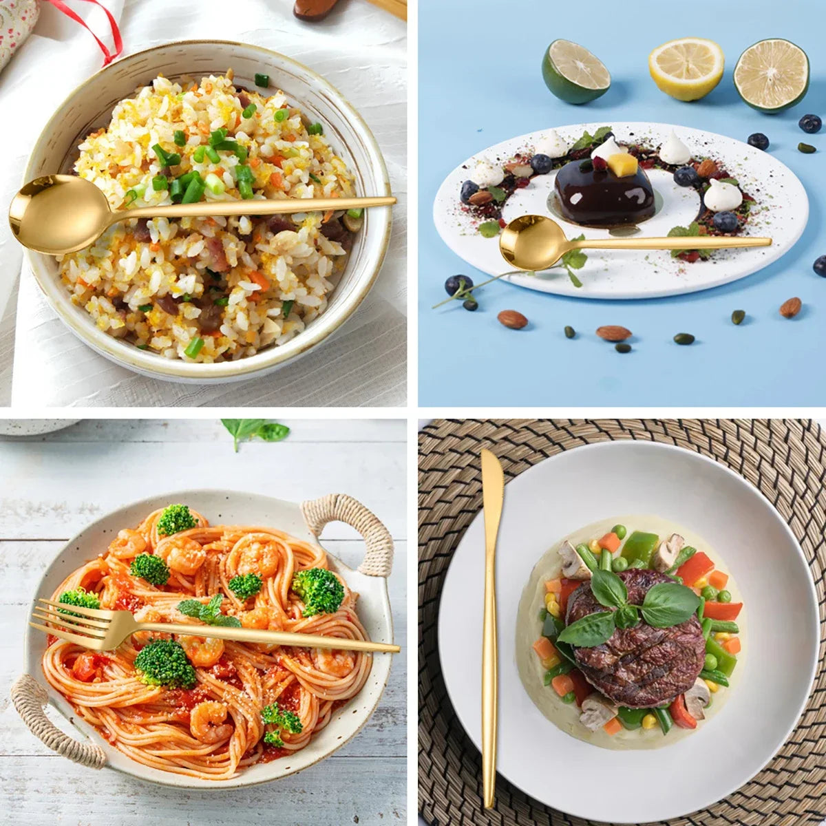 - Elegant guldbelægning: Den gyldne overflade giver bestiksættet et luksuriøst look, ideelt til særlige lejligheder og festlige middage.